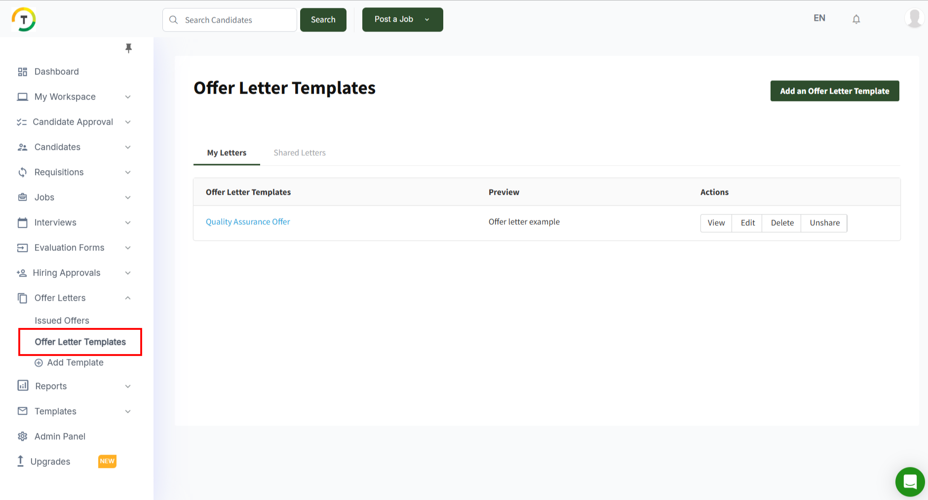 All created and shared templates are listed on the Offer Letter Templates page.
