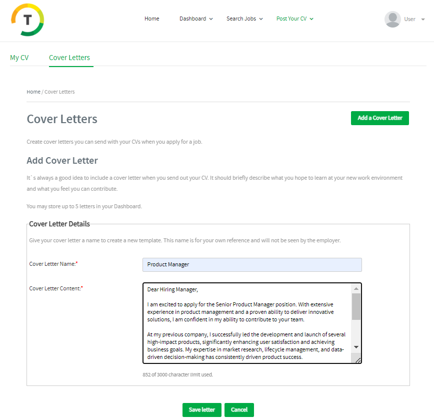 Add the cover letter’s name and content then save the letter.