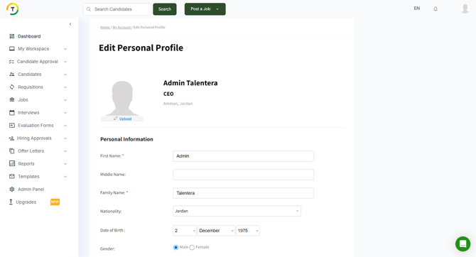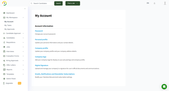 The My Account section allows you to manage your personal and company information in one place. You can update your password, edit your personal profile, and manage your company profile and logo (For Super Admins ONLY). It also lets you upload a digital signature that can be added to approved requests such as offer letters, and modify your email notification settings to match your preferences.