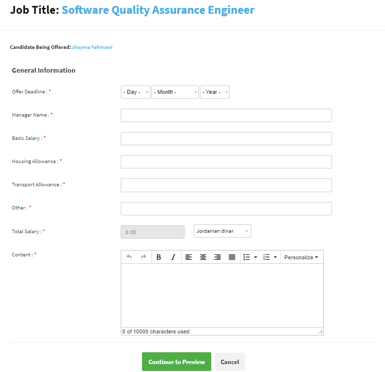 In order to proceed with the hiring process, and after approving the candidate, the HR manager or the hiring manager will send an offer letter to the candidate by clicking on the Send Offer Letter button on the CV view.