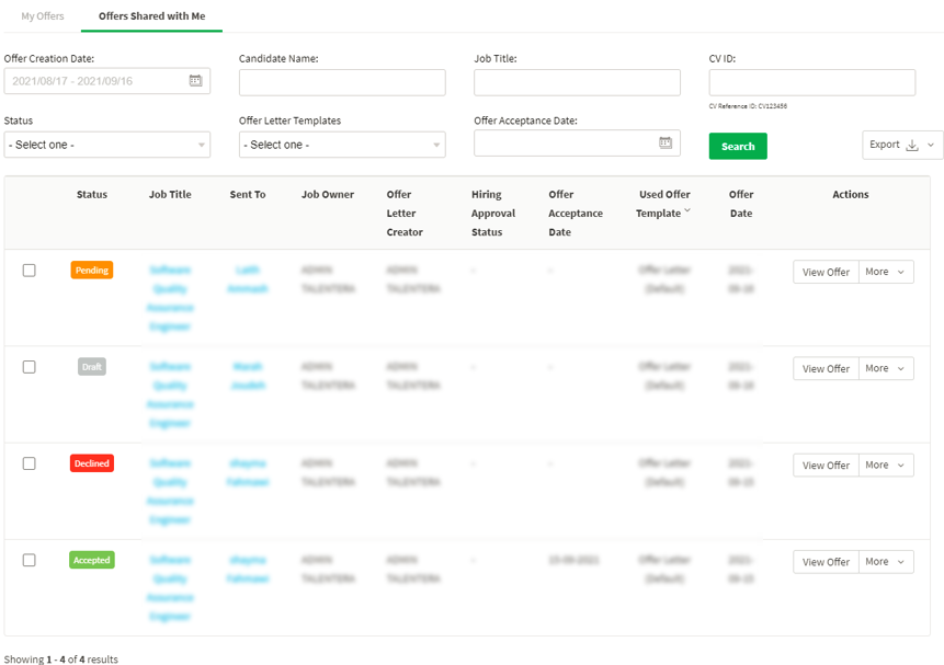 You can search the results by Offer Creation Date, Candidate Name, Job Title, CV ID, Status, Offer Letter Templates, and Offer Acceptance Date.