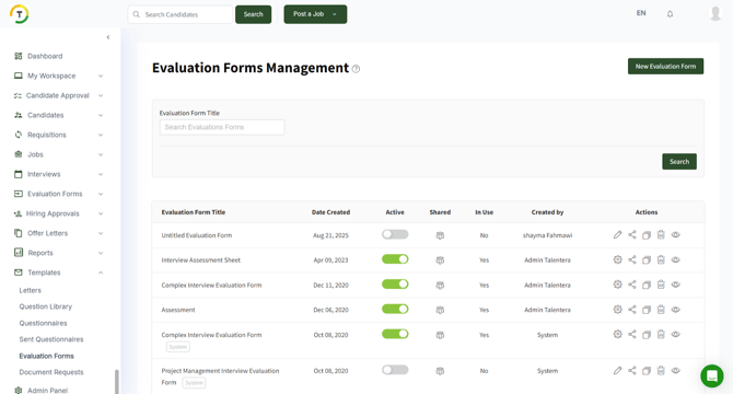 The employer can add an evaluation form by clicking on ‘New Evaluation Form’.