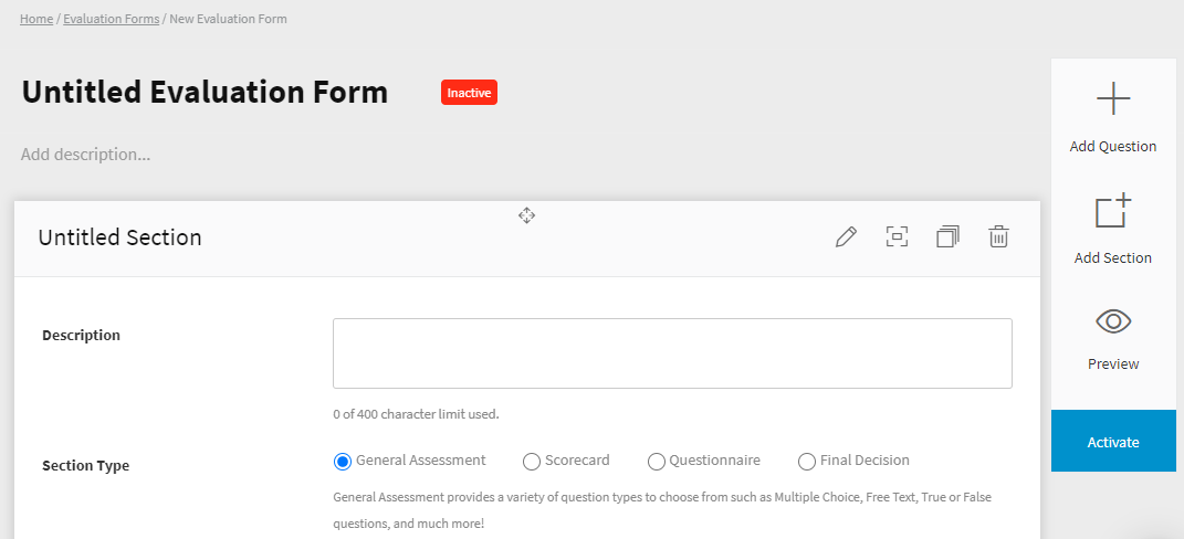 General Assessment- It provides various question types to choose from, such as Multiple Choice, Free Text, Yes/ No questions, and much more!