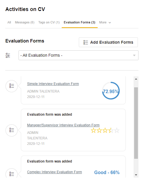 The filled evaluation forms will be added to the Activities on CV- Evaluation forms tab.