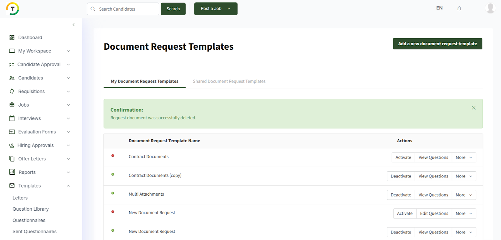 The Document Requests feature makes it easy to request documentation when finalizing the recruitment for a candidate.
