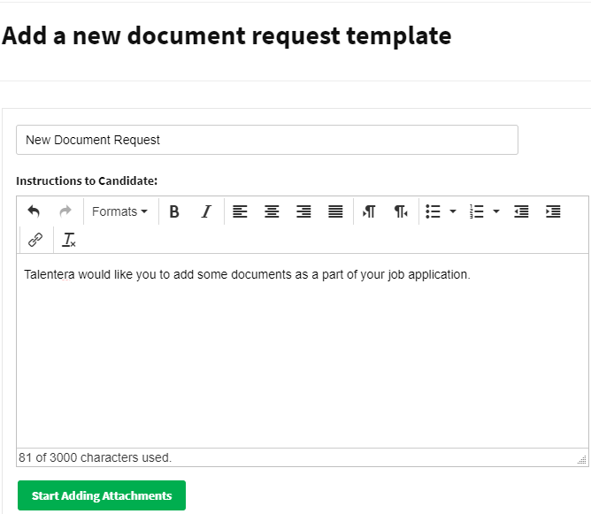 A new document request can be added by clicking on ‘’Add a new document request template’’ then click on ‘’Start Adding Attachments’’ after adding the title.