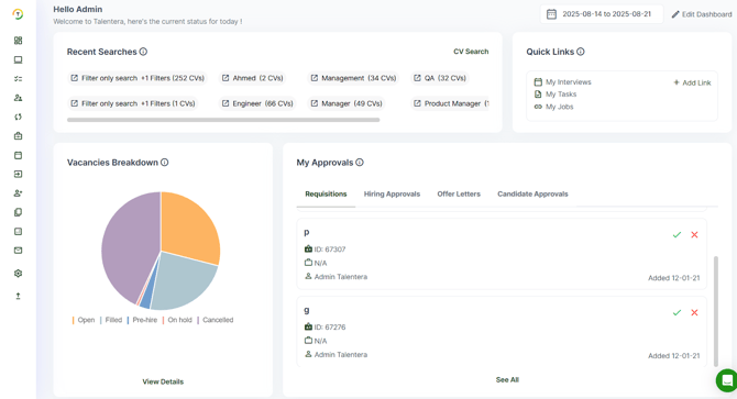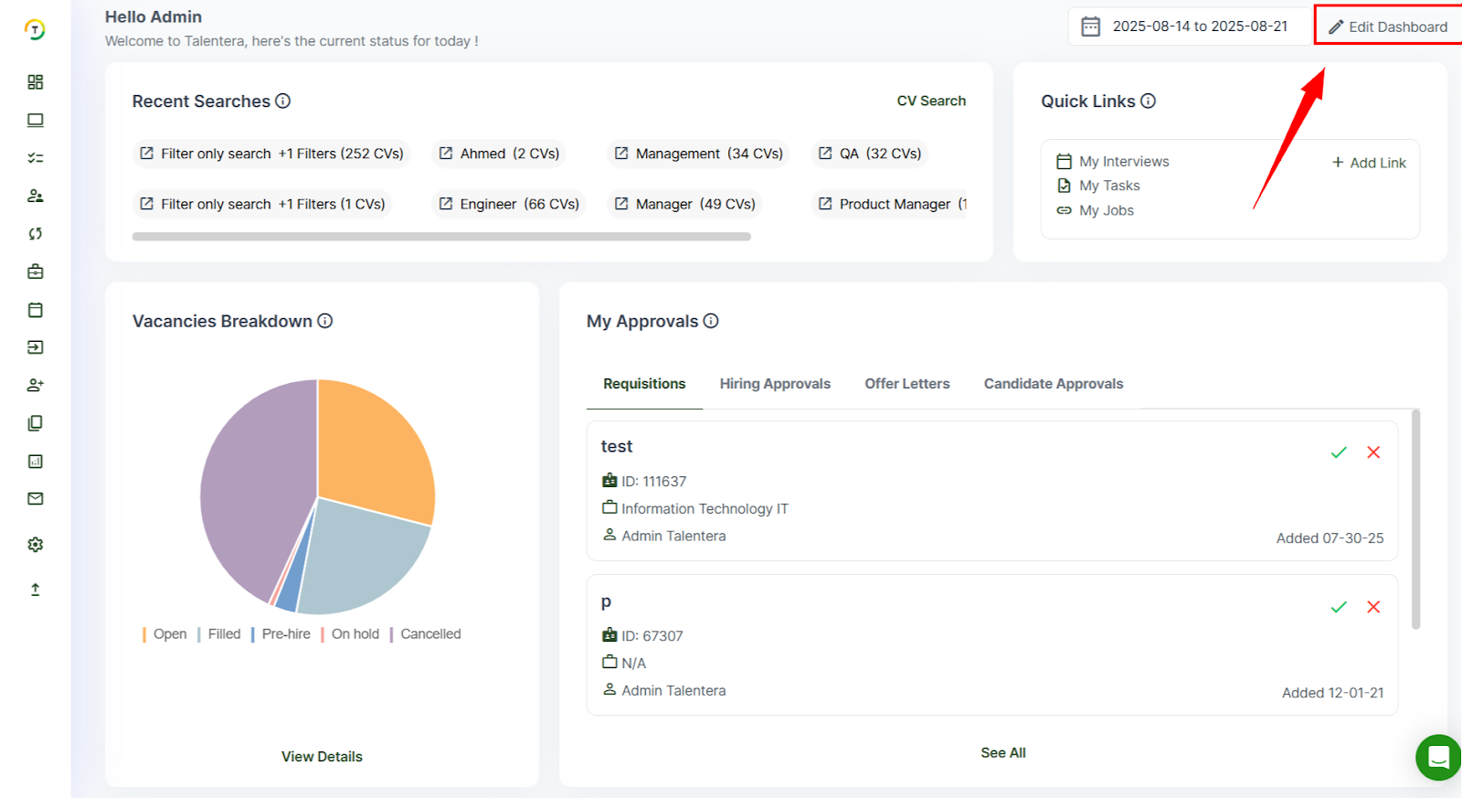 The Dashboard section in Talentera provides an at-a-glance overview of key statistics and insights through customized widgets, offering flexibility to tailor the layout according to your preferences. You can arrange and personalize widgets such as Talent Acquisition Summary, My Approvals, Vacancies Breakdown, Jobs Overview, My Tasks, Upcoming Interviews, and many more. This customization enables users to focus on the most relevant data, streamline their daily workflow, and monitor activities across the platform efficiently.