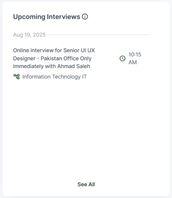 The Upcoming Interviews widget displays all interviews that have been confirmed by candidates and are scheduled within the next three days.