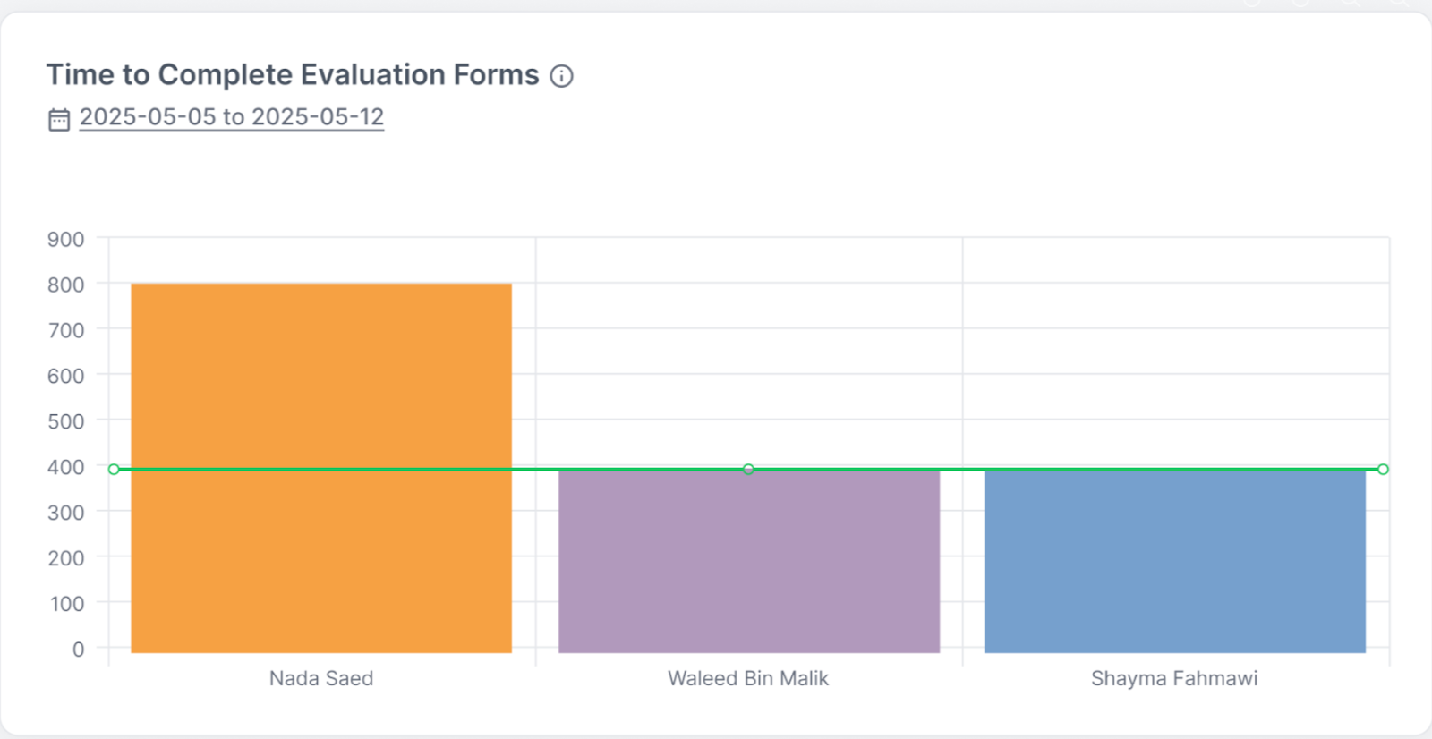 The Time to Complete Evaluation Forms widget tracks how long it takes each recruiter and hiring manager to complete the evaluation forms assigned to them. This helps monitor responsiveness, identify delays, and ensure the evaluation process stays on schedule.