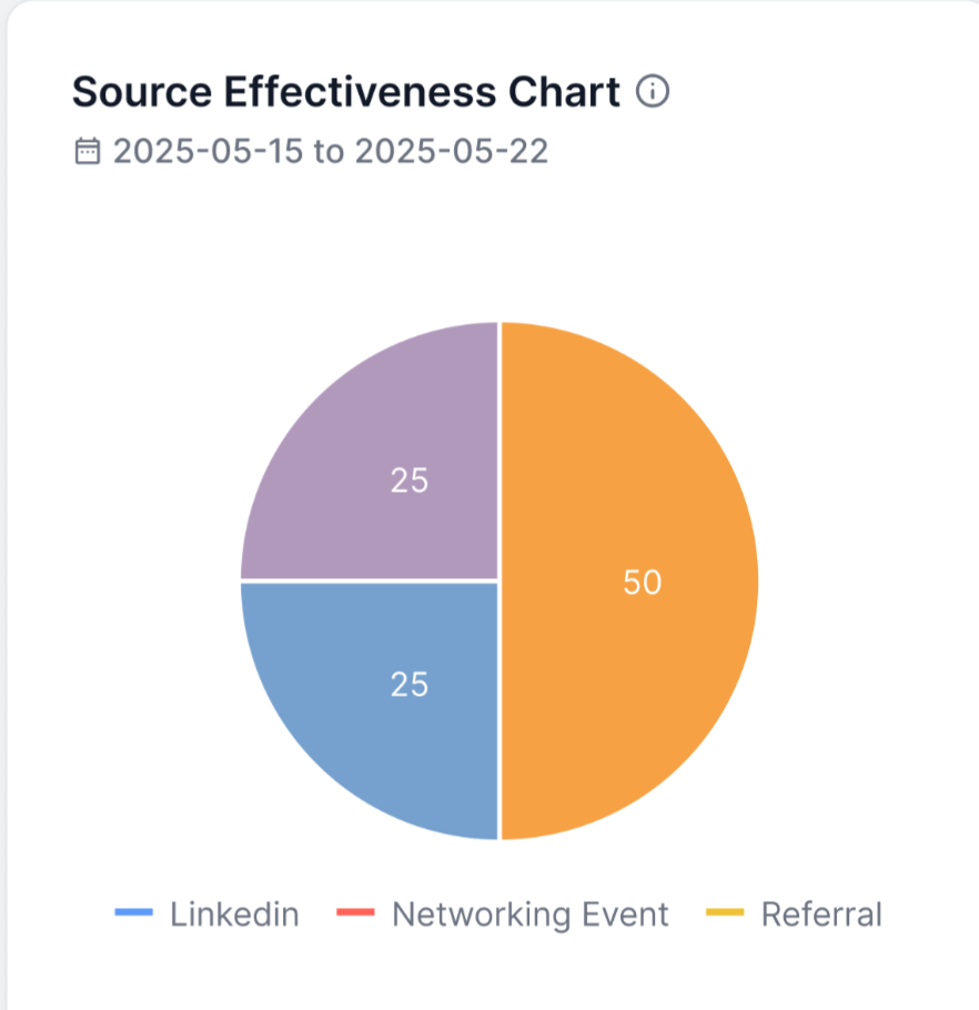 The Source Effectiveness Chart widget shows how each recruitment source is performing in terms of the number of hires generated during a selected time period. This insight helps you evaluate which sources bring the most value and optimize your recruitment strategy accordingly.