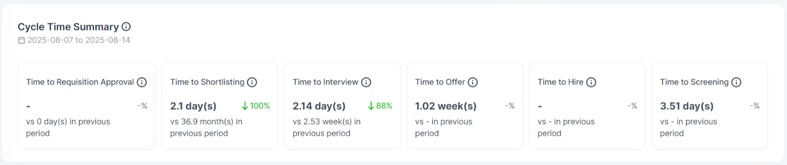 The Cycle Time Summary widget allows you to monitor the performance and efficiency of your recruitment process through key time-based metrics. It tracks the time to requisition approval, time to shortlisting, time to interview, time to offer, time to hire, and time to screening. By analyzing these metrics, you can identify bottlenecks, optimize workflows, and ensure a faster, more streamlined hiring process.